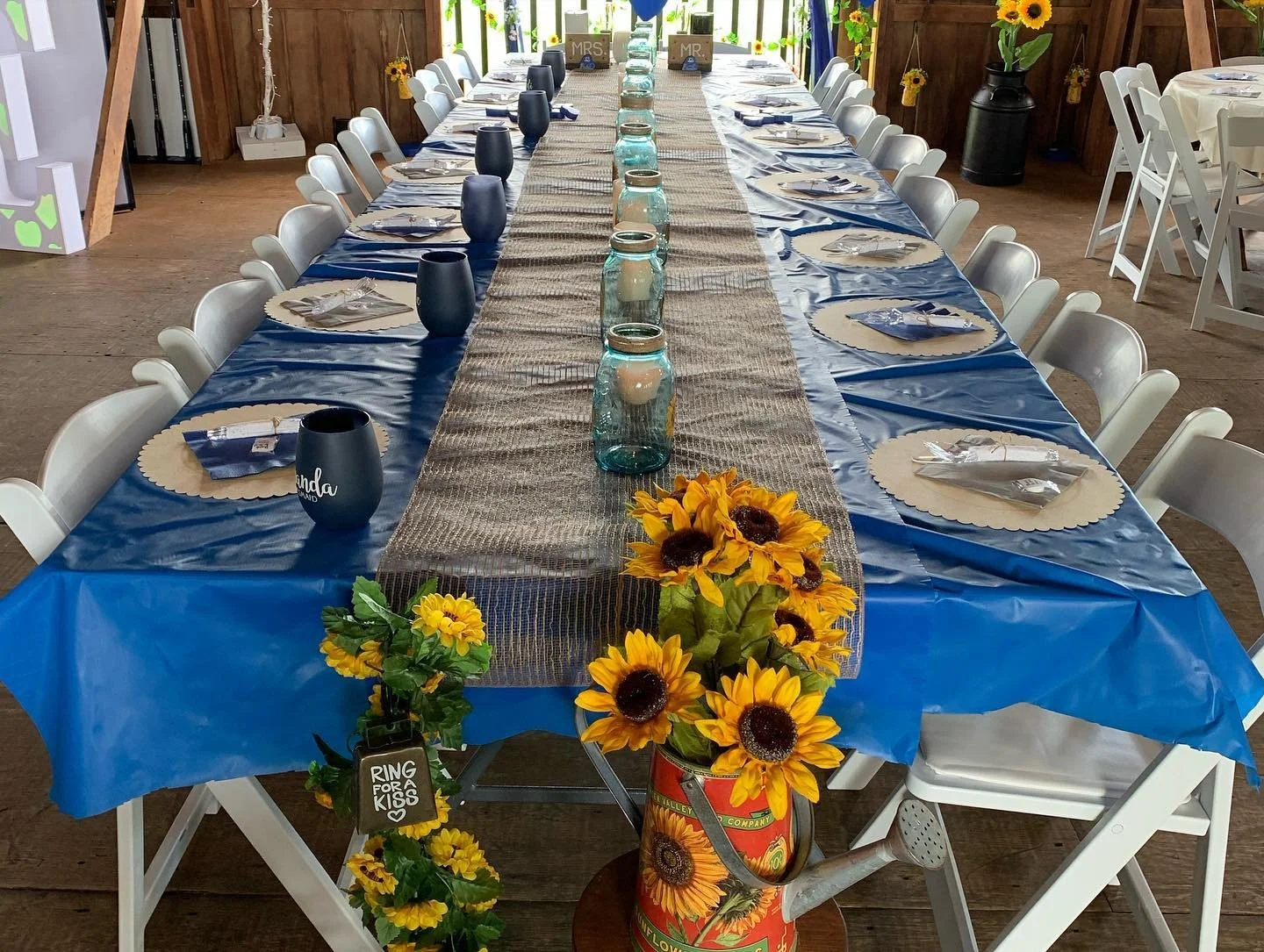 This couple wanted a casual wedding, which was so fun! The men wore jeans and plaid shirts. Each guest was greeted with a real sunflower. The royal blue, gray, and pops of yellow made for a picture-perfect summer wedding. So much so that the dance lasted on the patio the entire evening!